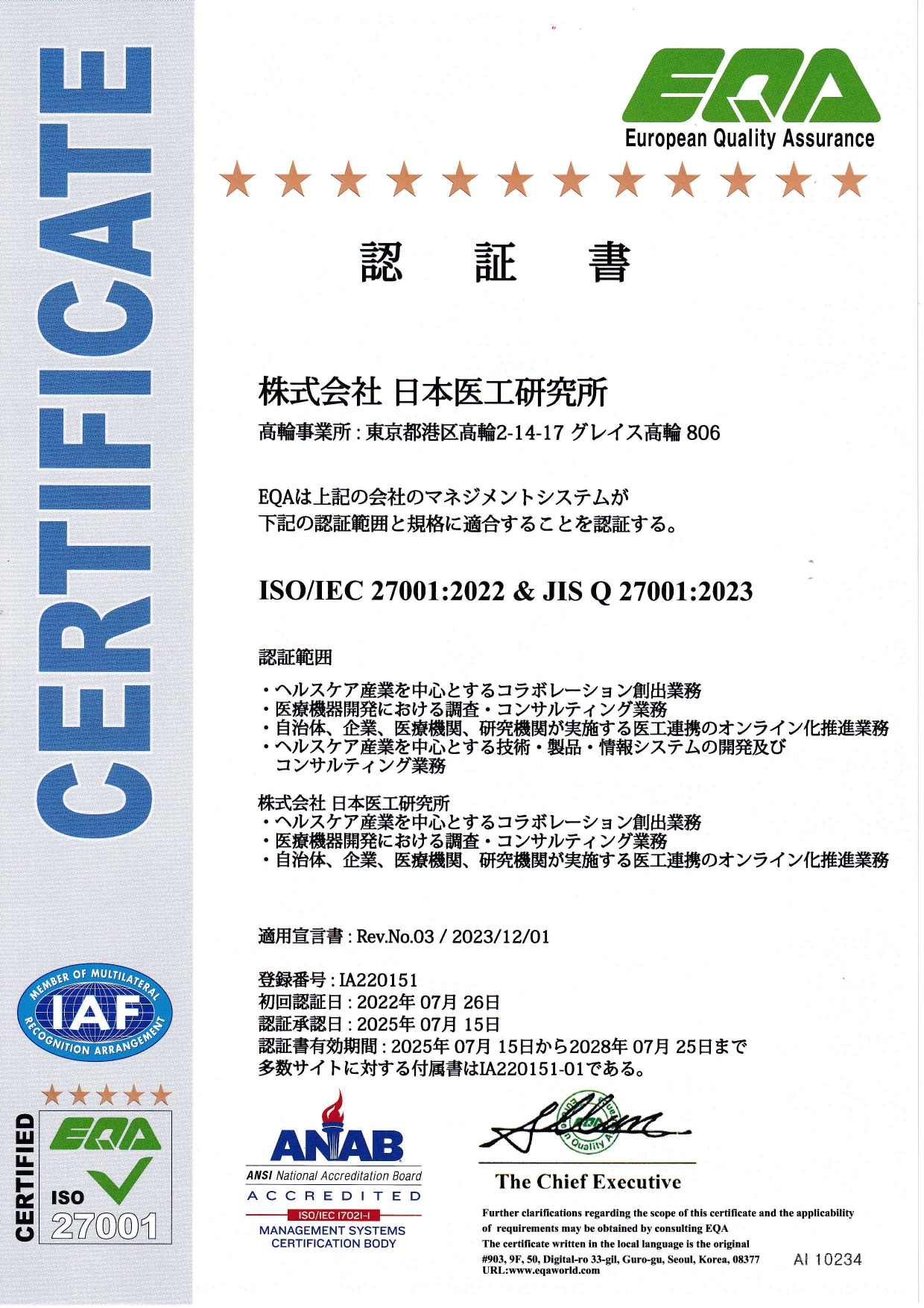 株式会社日本医工研究所(以下、「当社」といいます)は、法的要求及びその他の要求事項を遵守し、第一にお客様はもとより、当社のサービスに関わる全ての人々の満足を得る事を目標とし、信頼・安心される会社を目指します。